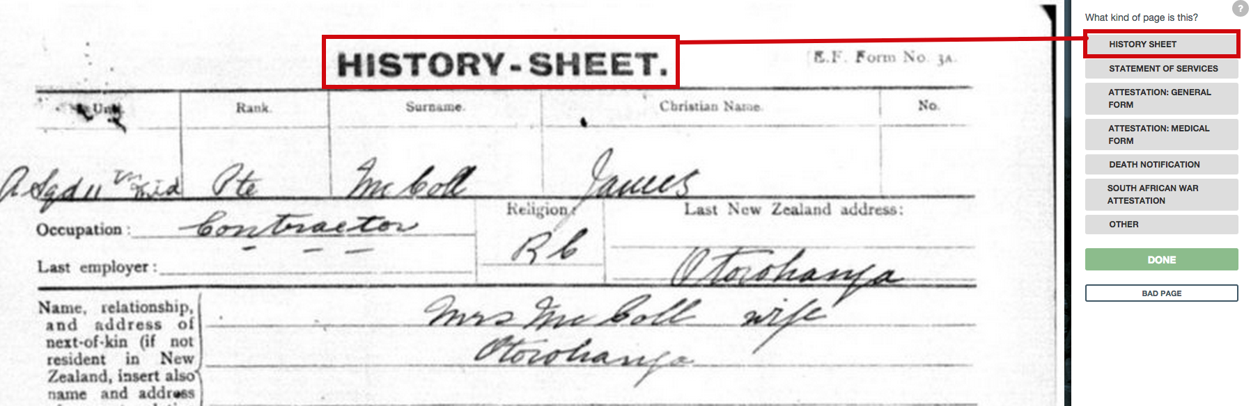 We eventually want to mark variables on the History Sheet, the Statement of Services (which is really page 2 of the History Sheet), the Attestations, and any form of Death Notifications. These are the options for classifying a page, plus “Other”