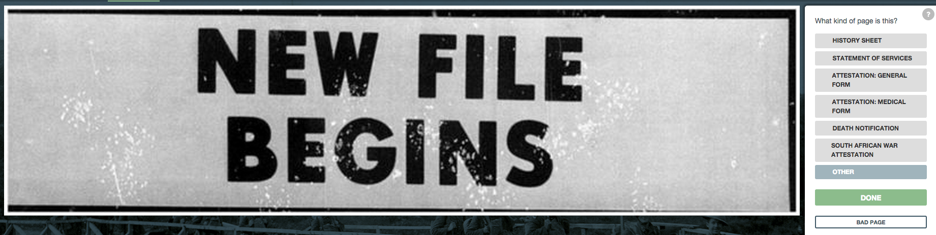 Here’s an image we marked as Other. This is one of the dullest examples — it’s like a place marker in the file. We can probably identify this as a “NEW FILE BEGINS” page using Optical Character Recognition. But stick with me for the example. We mark this as “Other”, and then click “Done”.