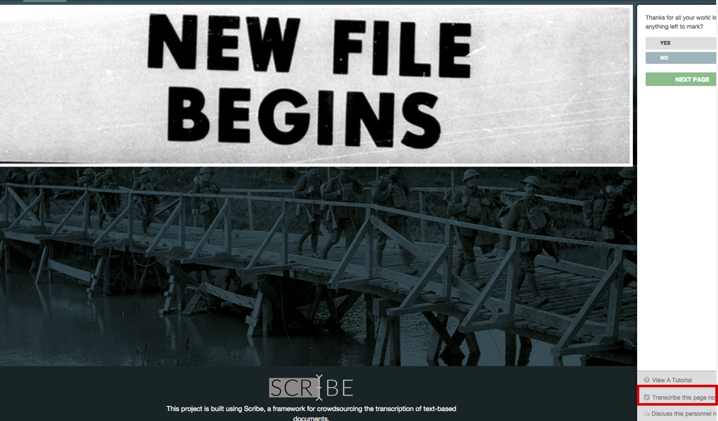 If you wanted to describe what this page was (if it was more interesting) you can click on “Transcribe this page now”. This brings up a dialog box that you can type in a free text description of the form. You can move the dialog box around so you can see what’s underneath.