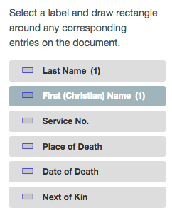 Now you look at the page for where is a last name. In this case the last name is not explicitly and separately present as a question. It’s combined with the first name. But as a citizen scientist you know that when you see “OneName, TwoName” with a comma in between the first item in the list is the last name. So you draw one box around that, and another around the first name.