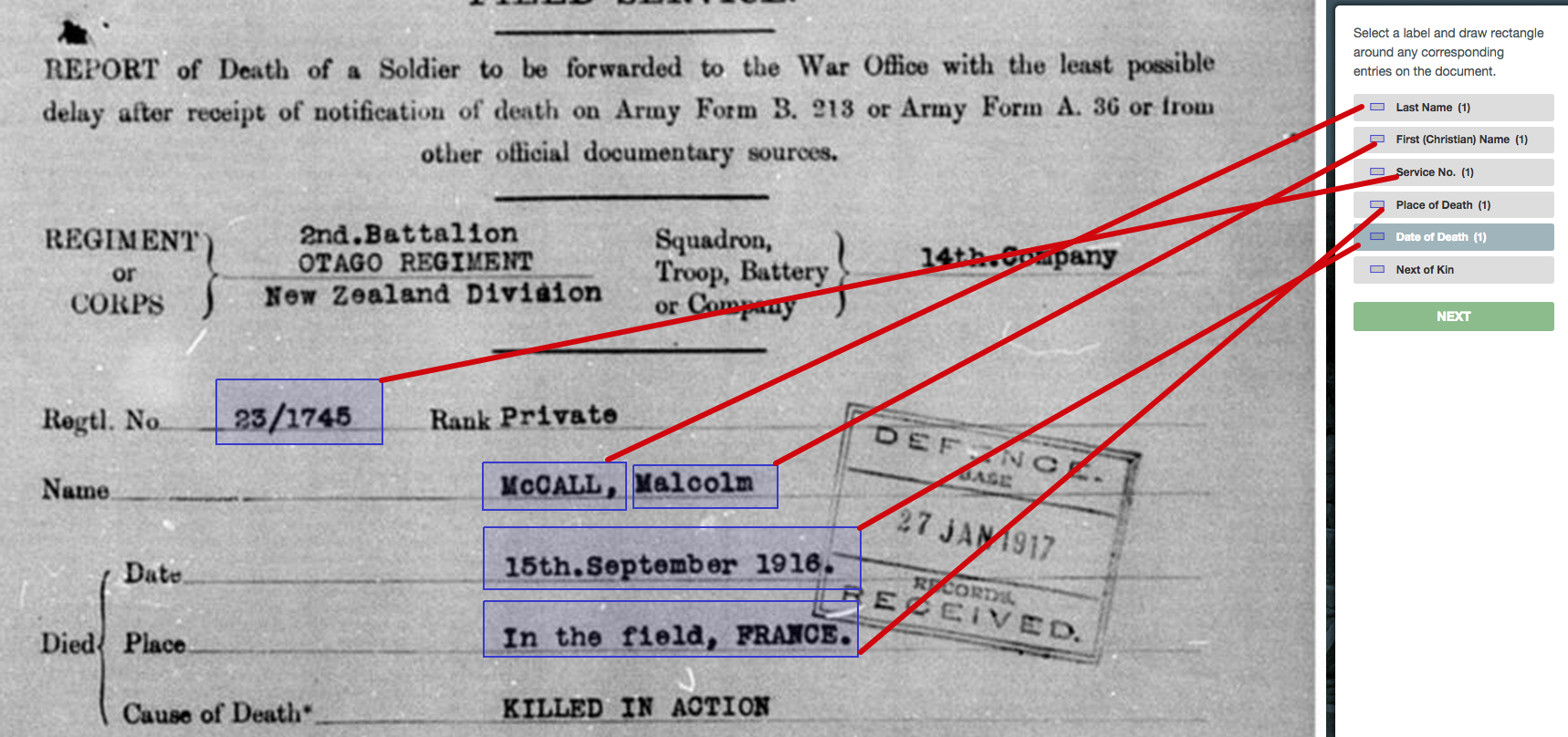 Lets look at the basics of marking by looking at a death notification, which has the fewest fields to mark and transcribe. There are two different types of death notifications you’ll see, depending on whether someone died in service, or many years after. The example we’ll use here is a notification of a death in the field.